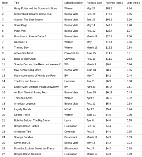 2002 VHS Sales: Top Videocassette Titles